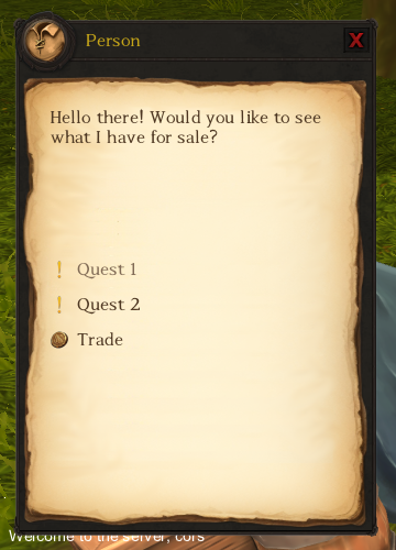 Next was adapting the basic structure of a dialogue system into a fully functioning and interactive user interface. This is also the core of many features (i.e. talking to NPC's, shops, trading, etc) so the early work here paid off well. The actual dialogue window is very similar to other games and isn't quite what i'm going for but it works for now. Will likely end up with something similar to OSRS with a rectangle dialogue box and shorter conversations. Not many people read those long text blocks anyway.